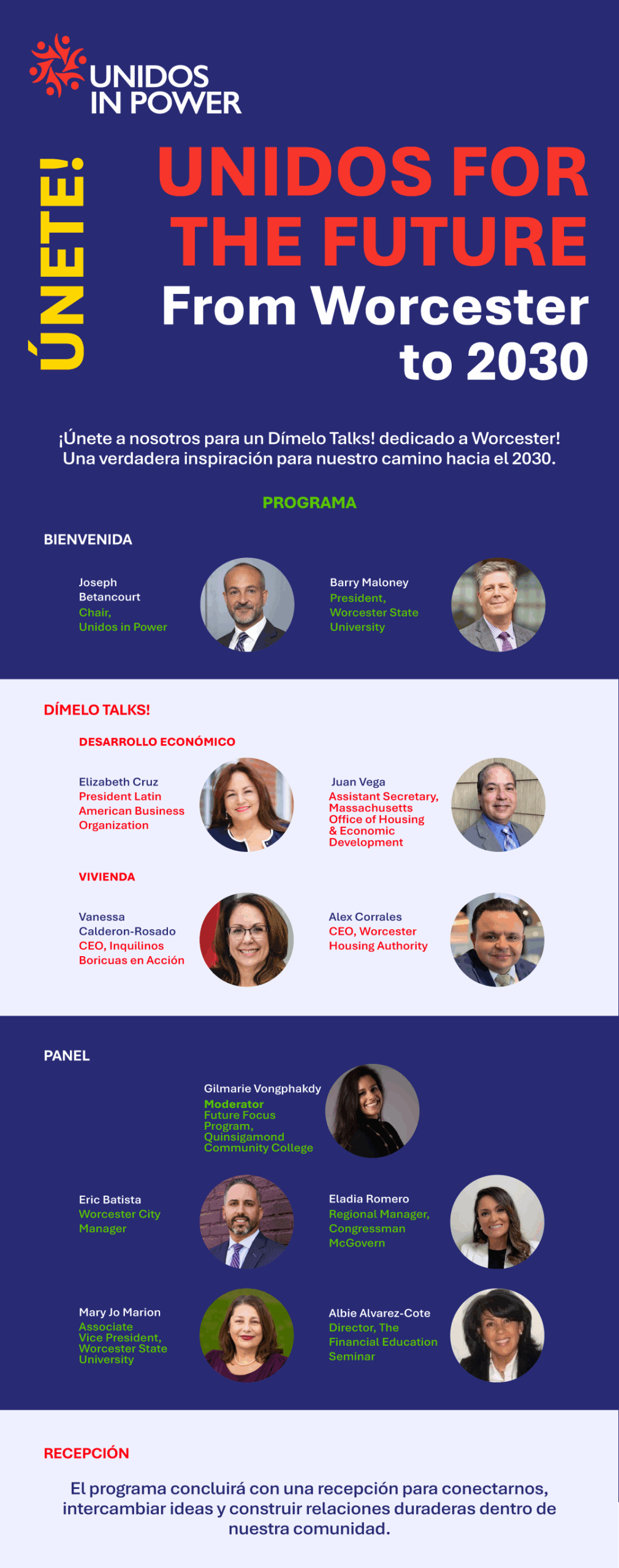 En Unidos for the Future: From Worcester to 2030, exploraremos dos temas fundamentales — Vivienda y Desarrollo Económico — a través de potentes Dímelo Talks y un panel dinámico de discusión.